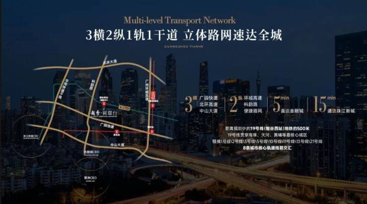 • 3横2纵主干道,速通珠金琶,北环高速+广园快速+中山大道/环城高速+科韵路