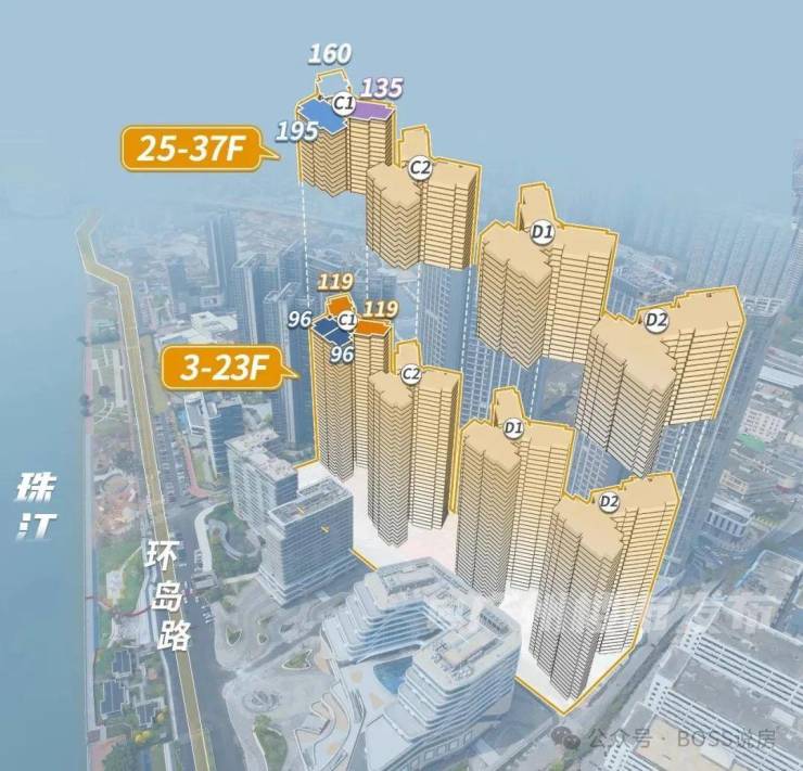 高区为25-37层,两梯三户,有建面约135、160、195平三种户型。