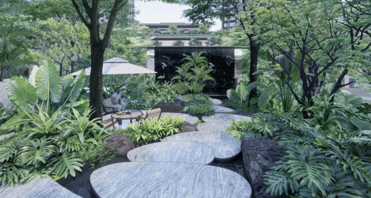 结合方案效果示意图来看,S1S2地块中庭均规划有大面积室外花园与水景。