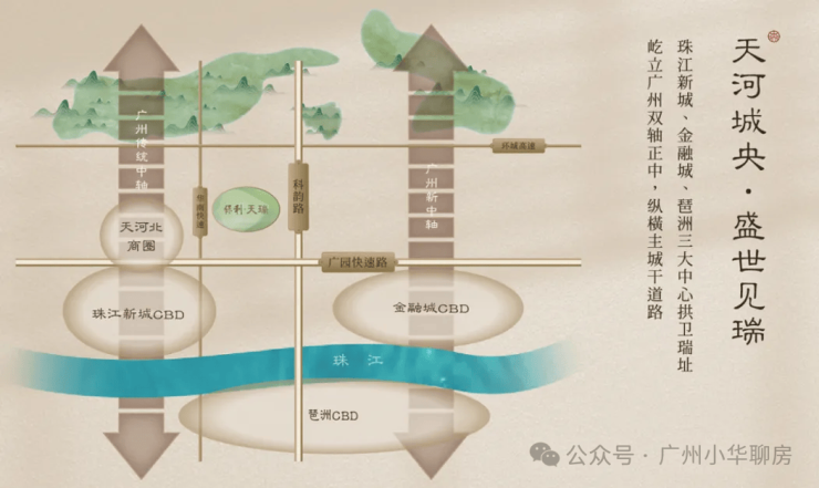 项目位于天河五山汇景新城板块内,珠江新城和琶洲金融城两中轴间的核心位置,楼盘身后就是汇景20年醇熟的圈层配套