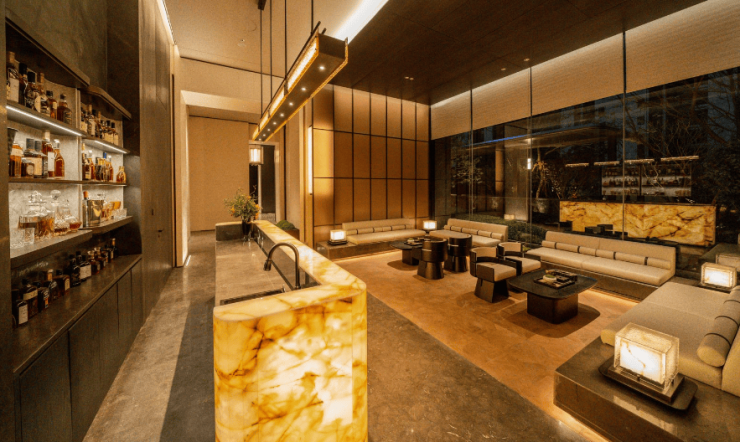 对标纽约第五大道安缦酒店同款泳池,打造约550㎡奢配泳池,集成人泳池、儿童池及按摩池等豪宅泳池配置,并设置星级酒店会所吧台。其中,仿生自然生态流水瀑布高约 5米,选用南亚宇宙黑金奢石为主材,搭配“奢石中的爱马仕”巴西铂金钻打造酒店式吧台,尽显奢华;