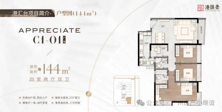 144㎡四房两厅二卫,东南向户型,阳光入户,瞰景主套房,270度望江,餐客厅一体,阔尺享受,奢享级四房,三代同堂