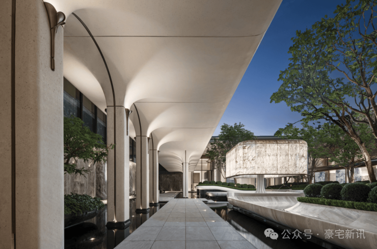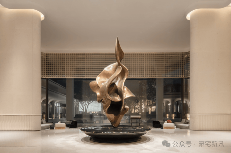 二进院“水境回廊”,将令人惊叹的“文化浓度”融于空间。六扇瑞兽纹墙以岭南剪纸工艺呈现,象征“六合天地”;两吨重约7.5米高鎏金铜门,由非遗大师朱炳仁锻造。