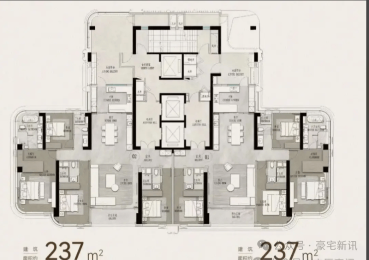 226-227㎡为4房4卫,88.4m大方厅搭配超宽落地景观面,多数房间可望江。