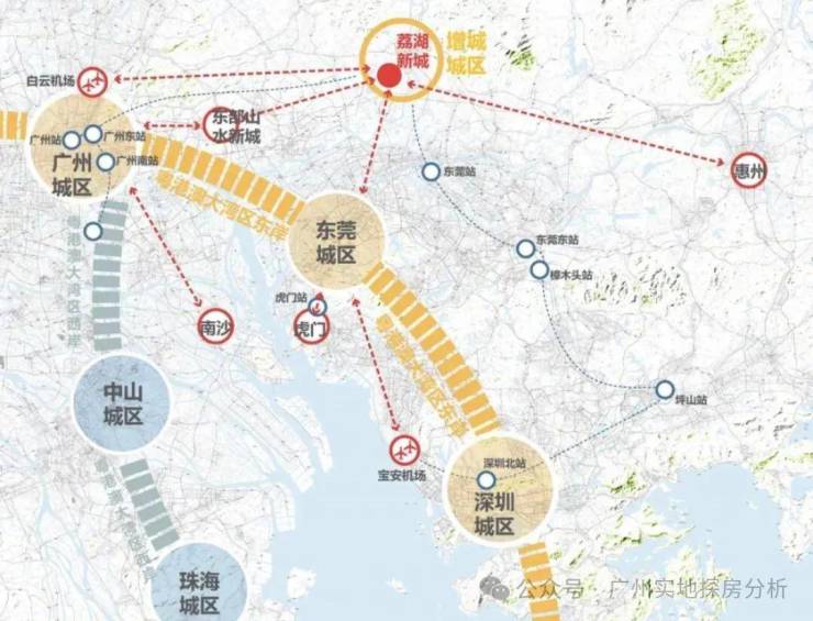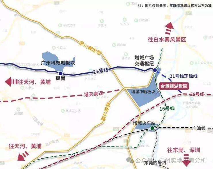 当前依赖自驾(新城大道/荔新快速路),21号线增城广场站约5公里;规划中的16号线(挂绿湖站)、28号线支线若落地将提升通勤效率。