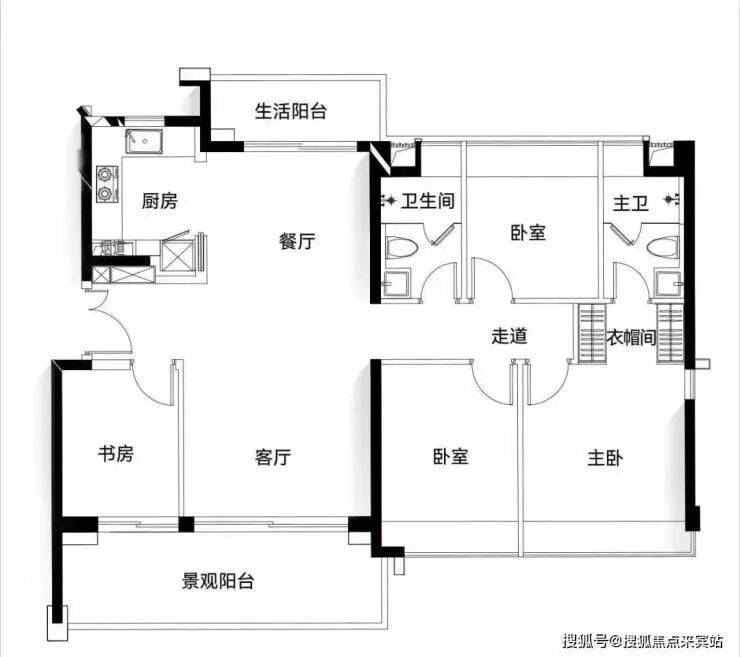 而约124㎡四房则是121㎡的PLUS版本,整体格局大差不大,不过就是在餐厅北侧多了一个生活阳台,而景观阳台也连接到了书房位置。