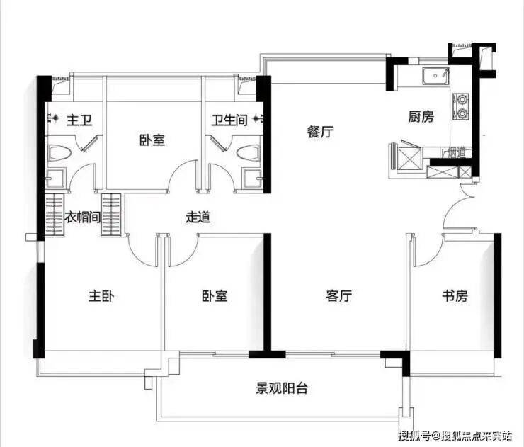 主套有做衣帽间设计,加分,卫生间也是干湿分离的设计,门口的书房也能用作老人房用途。