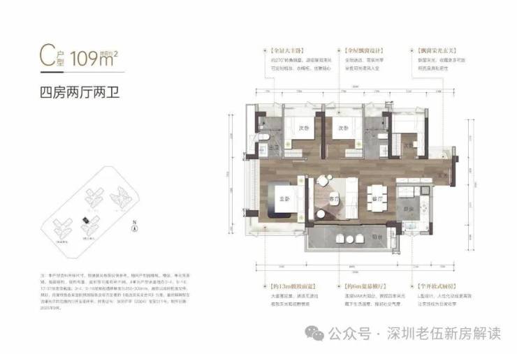 横厅设计,玄关宽敞收纳空间比较多,大面宽观景,通透无遮挡,L型厨房,客餐厅一体,主卧套房设计,约270°转角飘窗。