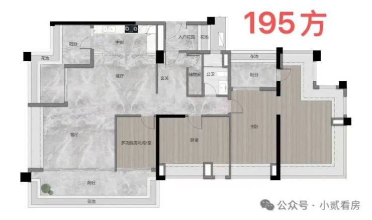 建面约195平的户型,阳台长度做到约8米,整个LDK客餐厅面积约达到70方,两侧观江面加起来更长达约16米!不夸张的说,整个LDK空间感堪比酒店的江景宴会厅!