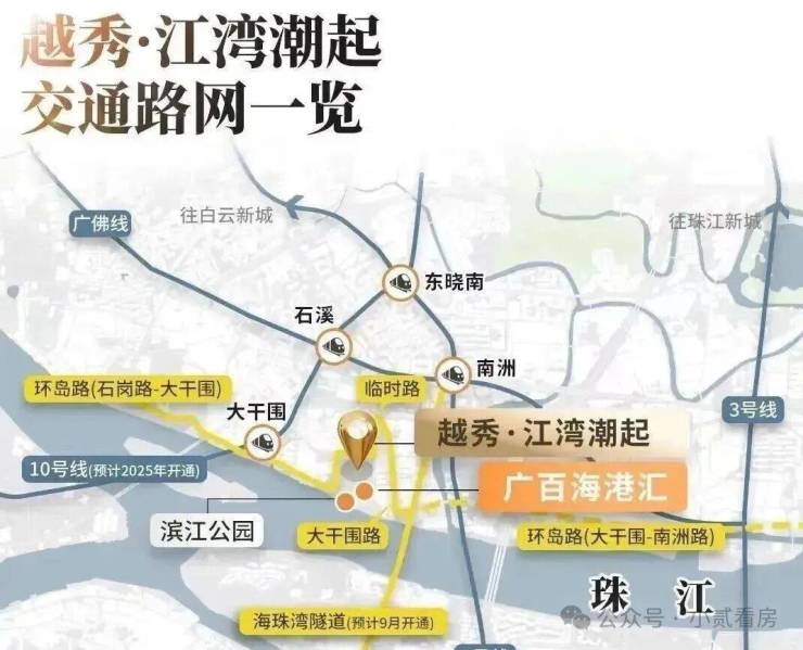 地铁交通,距离正在建设中的地铁10号线大干围站约650米,预计今年年底通车,直达天河、越秀、海珠等区域,出行非常便利。另外,还有2号线南洲站和广佛线石溪站,不过得要一点多公里。