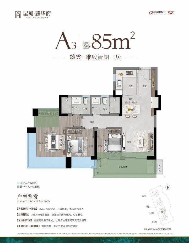 精阔2.0舒居空间,约100%使用率、配有270°飘窗全景主卧、LDKG超幕创变方厅、大开间向阳更通透。宽幕境界,致敬人生高光。
