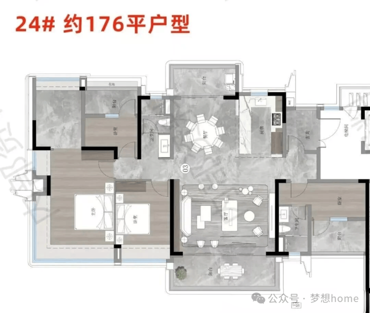 进入室内,则是集中式打造的公区,将高频使用的公区放置在户型中间,其他功能区环绕布局,塑造出流畅的洄游动线,同时还不存在浪费空间。