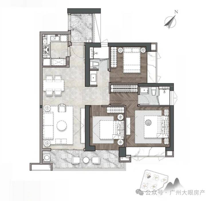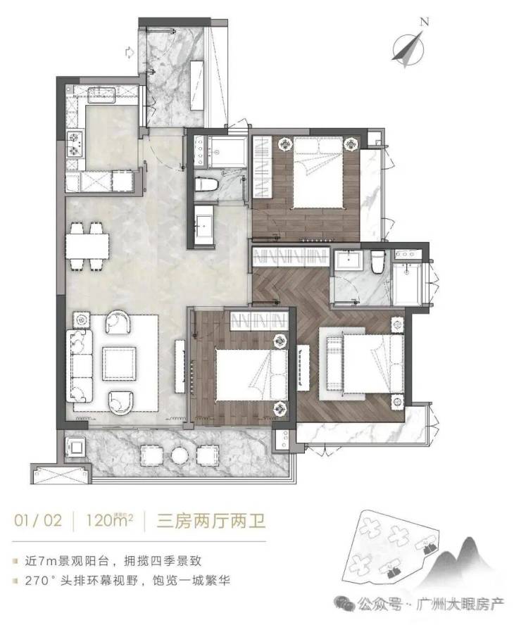 户户直望白云山,5栋山景大平层住宅,31-47层,东南向15°错落排布,直面主峰摩星岭