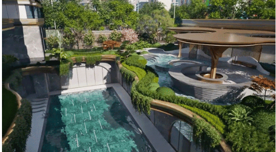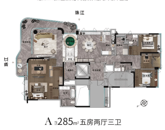户型设计聚焦高端改善需求:193㎡四房专梯入户,L 型江景阳台衔接客厅,主卧套房带步入式衣帽间与独立卫浴,满足大家庭居住;285㎡五房更是将江景优势发挥到极致,400 米三江交汇视野无遮挡,超大尺度客厅与全景阳台,成为宴请宾客、家庭互动的理想空间。项目配套堪称顶豪级别,自带超 1600㎡五星级酒店式双会所:首层会所 5.5 米层高,地面铺高登灰大理石,背景墙用意大利鱼肚白大理石,服务前台为亚马逊蓝大理石,搭配 10 米超白玻落地幕墙,直面园林;负一层会所规划 25 米长泳池(普拉达绿大理石通铺),配备男女独立更衣室、露天阳光躺椅,对标五星级酒店。地下停车场同样奢华,墙面柱体铺鱼肚白大理石,地面弃用地坪漆改用天然大理石,天花为劳斯莱斯星空顶,归家仪式感十足;园林结合 4.2 米水帘瀑布与蜿蜒溪流,普利雅黑大理石铺设地面,搭配金桂、蓝花楹等名贵树木,四季景观分明。