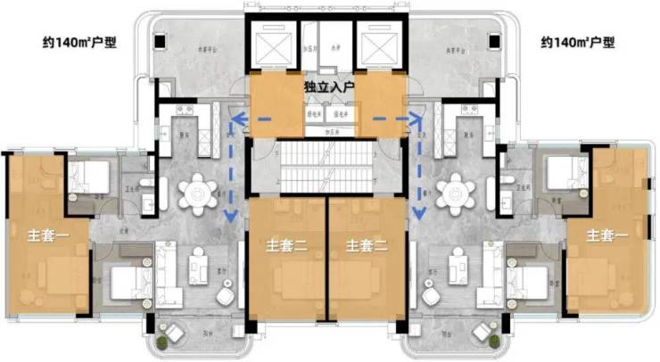 140㎡户型:2梯2户专梯入户的纯板楼设计,双主套三卫保证每位家庭成员的居住舒适度,长辈房朝南还近门口,两代人住一起互不打扰,各自拥有绝佳私密性。