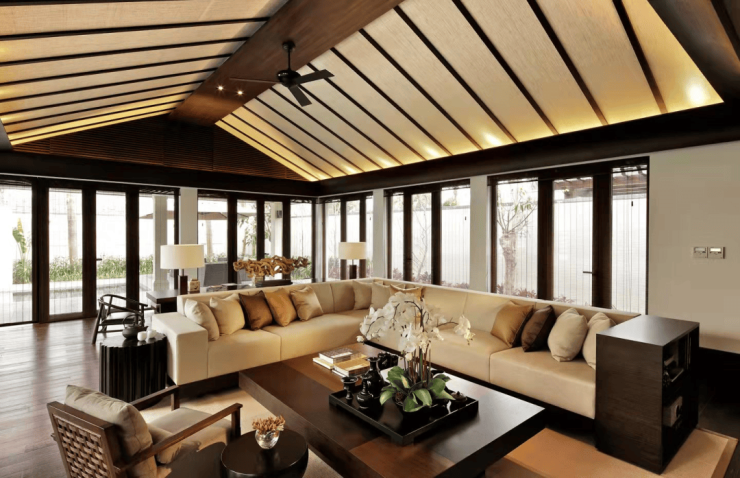 新中式别墅风格。檐梁栉比、粉墙黛瓦、木雕石刻,皆是一派纤巧古雅。无论是喝茶下棋,还是屋中小憩,都是一派雅致趣味。