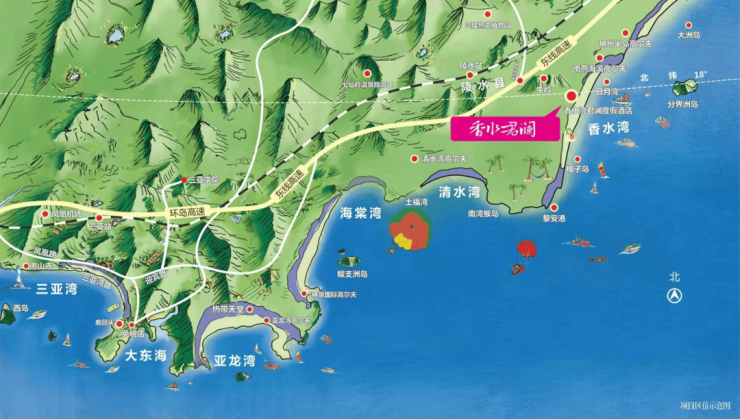 • 交通:距离三亚凤凰机场仅85公里,车程一个小时,乘坐环岛高铁仅二十分钟可以达到三亚站,同时项目距离陵水高铁站仅10分钟车程,距离海口市区约182公里,车程约90分钟