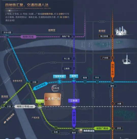 地铁——四地铁环绕,地铁广佛线燕岗站500米左右;地铁2号线江泰路站800米左右、地铁8号线宝岗大道站会远点1.4公里左右;在建的地铁11号线燕岗站串联海珠、越秀、荔湾、天河、白云等五区,最具人气的十大专业市场一站速达;