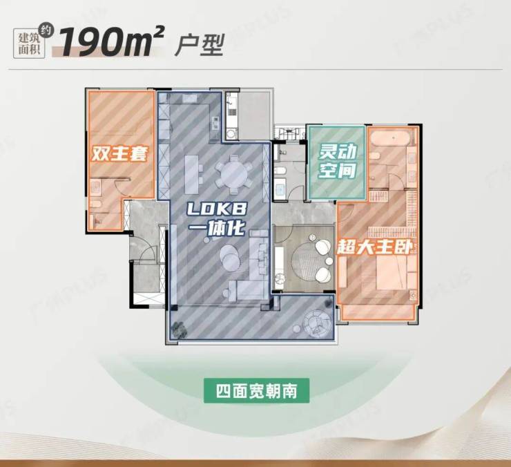 190㎡户型南北对流双阳台,南看2万方花园绿洲,北望珠江新城CBD,这就是触手可及的豪宅“天花板”该户型设有入户玄关和储物间,通过将客厅、餐厅、厨房和阳台一体化设计,LDKG布局创造了一个开放、共享的生活空间,使家庭成员可以更容易地聚集在一起,享受家庭时光。
