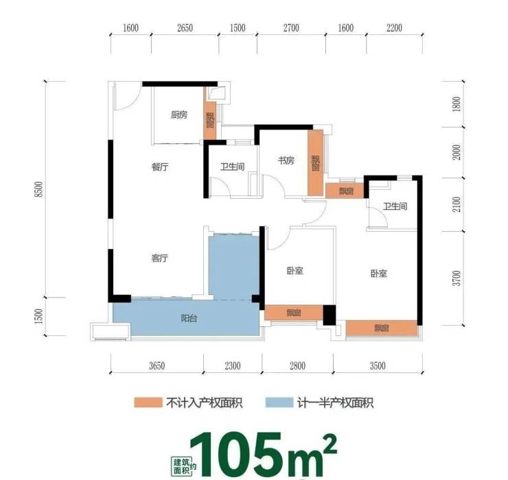 主卧双飘窗+次卧等面宽飘窗,全赠送高拓空间
