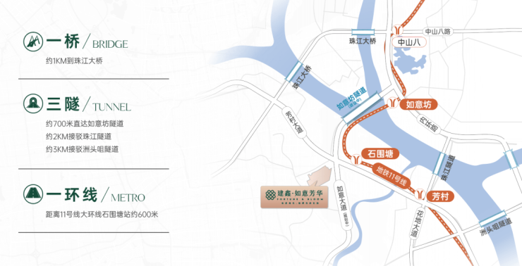 步行约600米可达11号线石围塘站,可便捷换乘多条地铁线路,通达全城。1站如意坊换乘6号线,1站芳村换乘1号线/22号线(建设中)2站中山八换乘5号线,直通珠江新城。