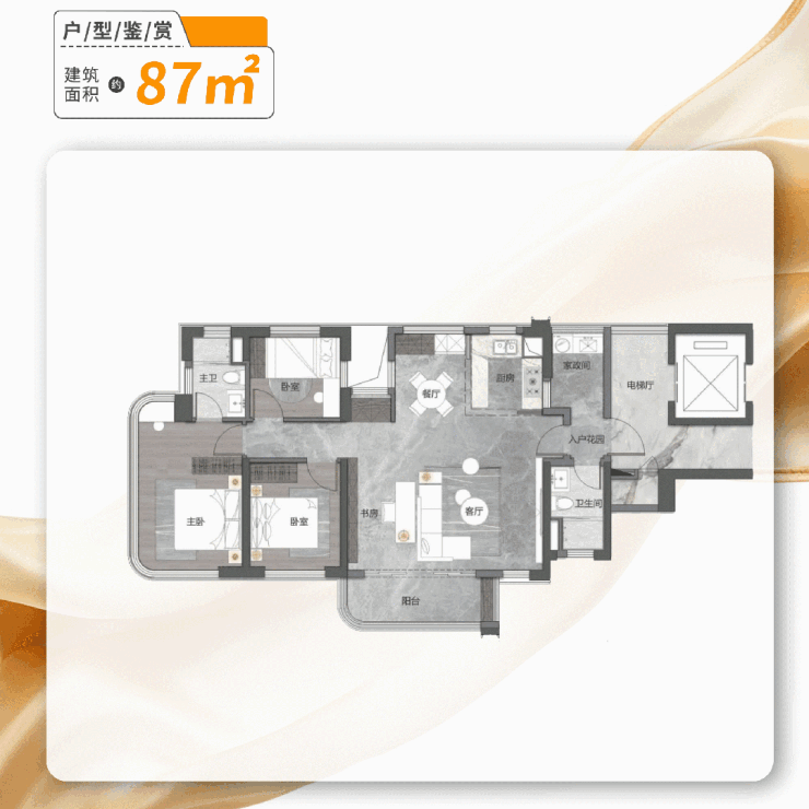 87㎡的面积段,突破性地实现南向四房、双卫布局,更搭配独立电梯厅的阔朗尺度。