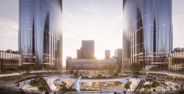 两座双子塔围绕下沉广场而设,与地铁站紧密相连,并通过独栋建筑实现公共空间和私人领域间的界限划分,让各功能彼此独立又形成连接。