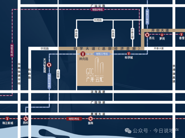 交通方面;项目位于黄埔区科学城中心研发的办公组团,南侧邻近连接广东主要城市的广深高速,北侧毗邻科学大道,交通便利。20分钟直达广州金融城、琶洲;30分钟直达珠江新城、新塘TOD、40分钟达广州南站;广州东、广州白云机场。