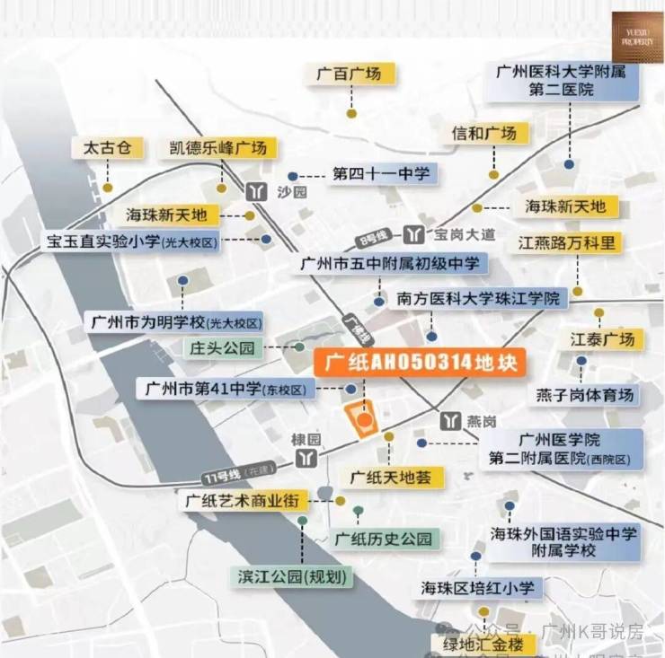 项目自身没有配建学校,但周边名校环伺,3km直线范围内包含广州市五中附属初级中学(省级)、广州市第41中学(省级)、宝玉直实验小学(光大校区)、江南外国语学校、工业大道中小学、红棉小学、海富小学、南燕小学、培红小学等9所学校环伺,拥有完善的区域教育体系。