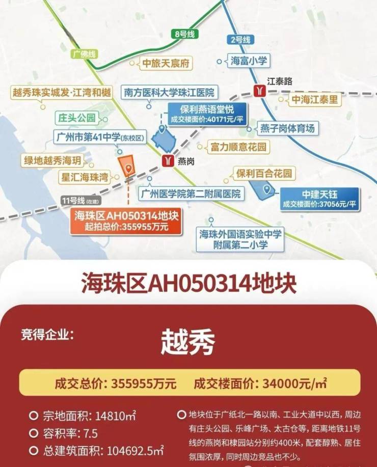 广纸314地块在2025年9月19日出让,越秀以楼面价3.4万/㎡、总价35.6亿元拿下,该地块体量不大,占地面积14810㎡,出让面积13959㎡,总建面约104693㎡。