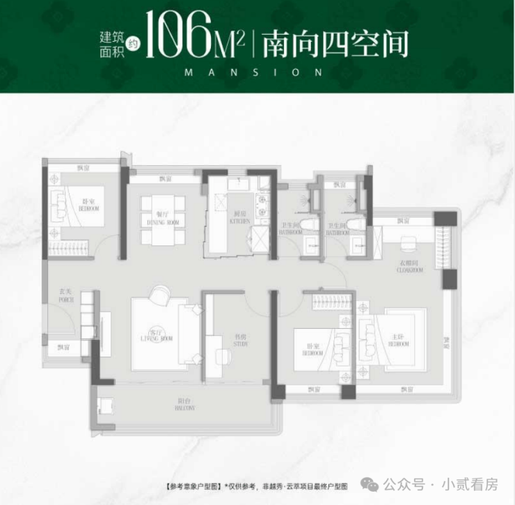 2、“0飘窗”黑科技:虽然阳台率从25%降到20%,但通过“0飘窗+薄墙体”设计,实际使用率120%,相当于107㎡户型能当128㎡用,直接叫板天河125㎡产品。