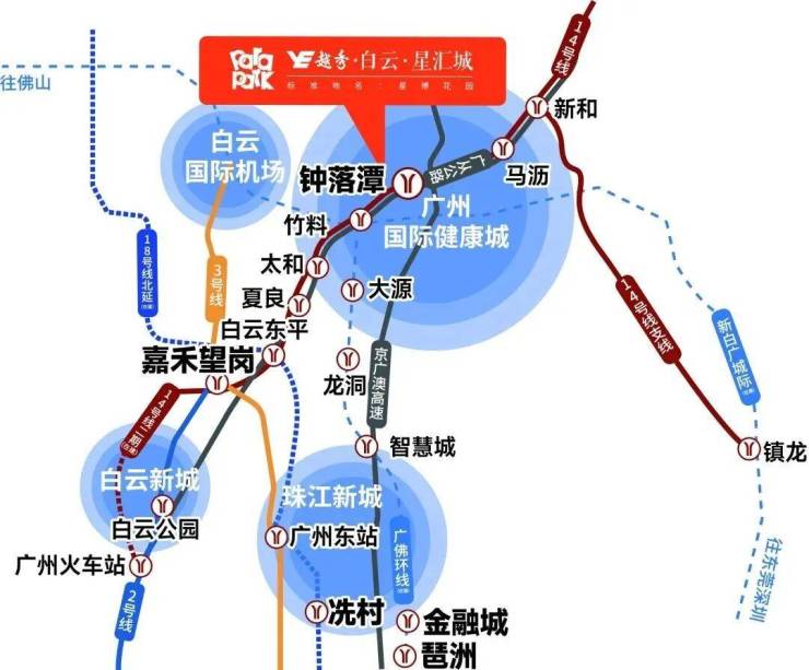 项目位于地铁14号线钟落潭站旁,5站到嘉禾望岗,换乘2、3号线可直通白云新城和畅达广州全城;
