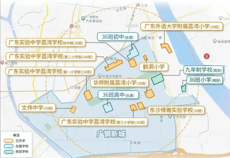 教育配套: 一路之隔就是广东实验中学荔湾学校第三小学部(简称“省实三小”,已于2022年9月开学);项目自身配建2所中小学,其中一间已确定为省级名校:广东省实验初中,预计2025年竣工;板块将形成32所学校集群,小学到高中一站式全龄教育唾手可得,打造15分钟教育圈。