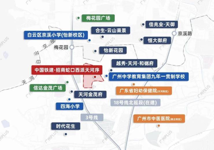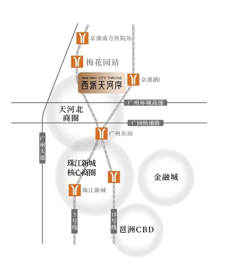 西派天河序位于天河区北部后天河北块,占位中轴北段,从珠江新城出发,驾车15分钟就能到达。步行距离约400米到达地铁3号线梅花园站,5站即达珠江新城CBD。