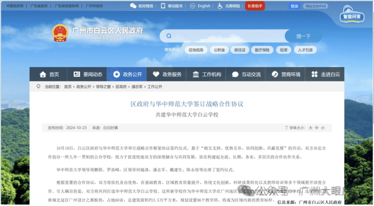 2024年10月18日,白云区政府与华中师范大学签订战略合作协议。