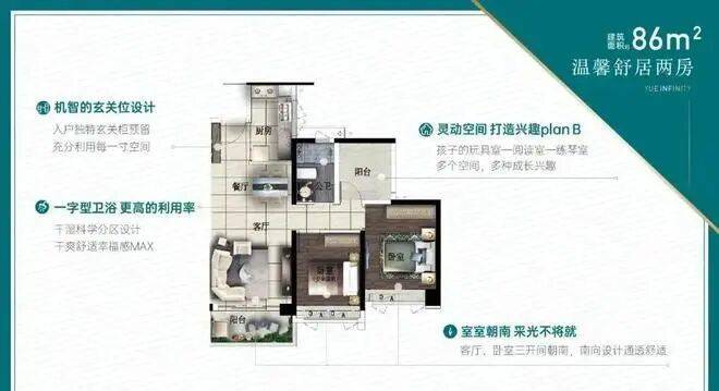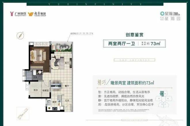 在户型设计上,项目推出了建面约73平方米的江景两室户型,凭借其独特的优势成为市场热销产品。该户型采用U型厨房设计,可与餐厅灵活打通形成“社交厨房”;阳台可根据需求改造成灵动空间,满足不同生活阶段的需求;同时,阳台和主卧均享有开阔的视野,可直接眺望珠江支流景观,将自然美景尽收眼底。