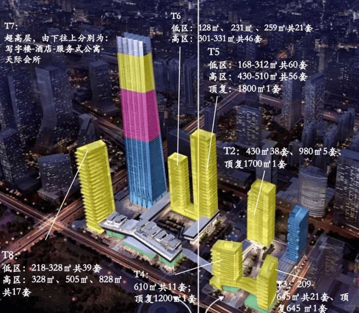 北区T1是写字楼,T2、T3、T4为公寓,南区T5、T6、T8为公寓,T7为环球商务中心;总建筑面积47.5万㎡。