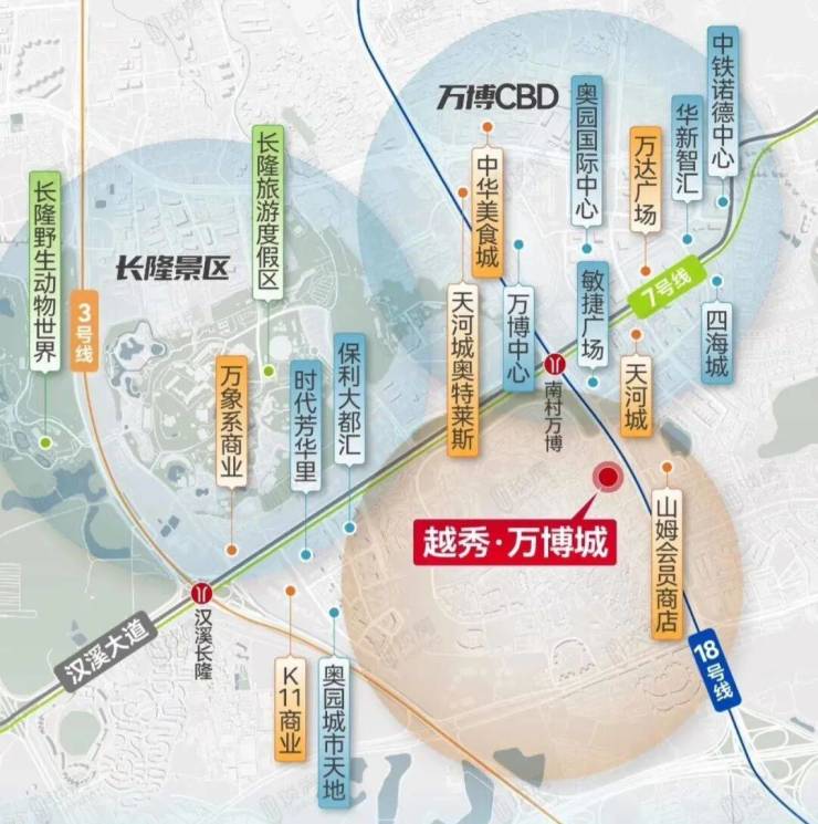 距离地铁7号线和18号线南村万博站约1.3公里,需电动车接驳;周边有汉溪大道、番禺大道等主干道,自驾出行方便,30分钟内可达珠江新城、琶洲等核心商圈。