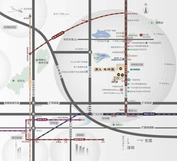 到广河高速仅约2公里,转华南快速通道约30分钟到珠江新城、穗莞深城际约20分钟到广州白云机场,约30分钟到深圳。