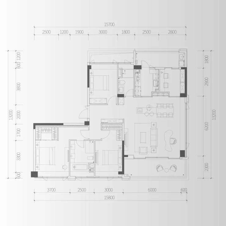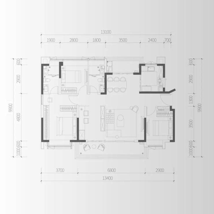 D2户型:建面约170㎡四房两厅两卫