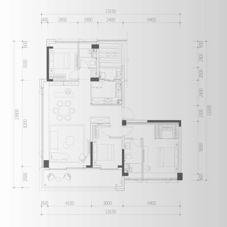 C2户型:建面约143㎡三房两厅两卫
