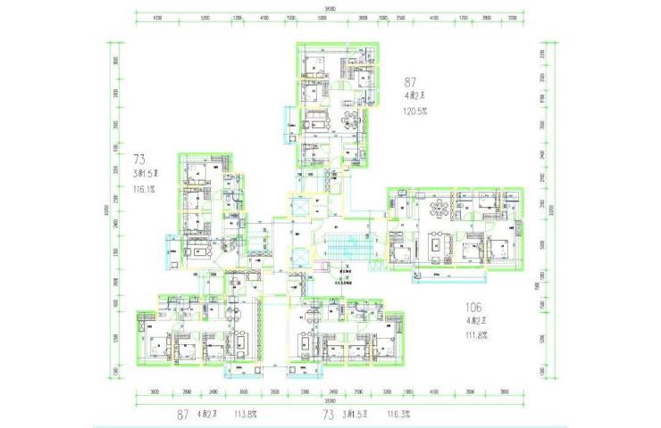 建面约87㎡四房2卫,,使用率为113%-120.5%。竖厅的为带独立玄关的竖厅布局,动线清晰;单边位设计,实现南北对流,并拥有U型采光面,主卧观景与采光效果更佳。在不足90㎡的空间内实现四房功能,极大提升了空间利用率。