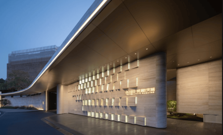 ①隐奢入口丨围合隐幽,奢韵天成 —— 100m超长入口界面,舒展盖顶与石材拼接院墙围合隐秘出入口,尽显自然隐奢豪宅气质。