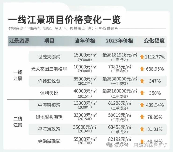 据统计,2013年至今,广州仅出让9宗临江地块,稀缺程度可想而知,江景豪宅价格变化幅度高达1112%。