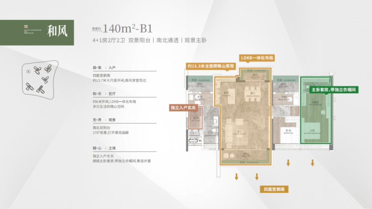建面 140 平 4+1 房,同样四开间朝南,南向采光面达到 15.7 米,保证室内充足采光。南北双阳台设计,通风良好。LDKB 一体化设计,使空间更加通透开阔。主套配置 270 度折叠屏飘窗,独特设计提升居住体验,可多角度欣赏窗外景色。