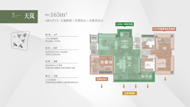 建面 165 平 4+1 房大平层,双阳台南北对流,通风顺畅。四开间朝南,中式厨房与独立西式岛台的搭配,满足不同烹饪需求。三面望山景,朝南面宽达到 17.4 米,近 9 米的 L 型景观阳台,将自然美景尽收眼底。双主套设计,保障家庭成员的私密性,主卧同样配备 270 度折叠屏飘窗,尽享舒适与奢华。