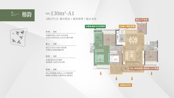 建面约130㎡,8 米的 L 型阳台,视野开阔。四开间朝南,餐厅打造全景飘窗,实现南北对流,通风效果极佳,室内空气清新。