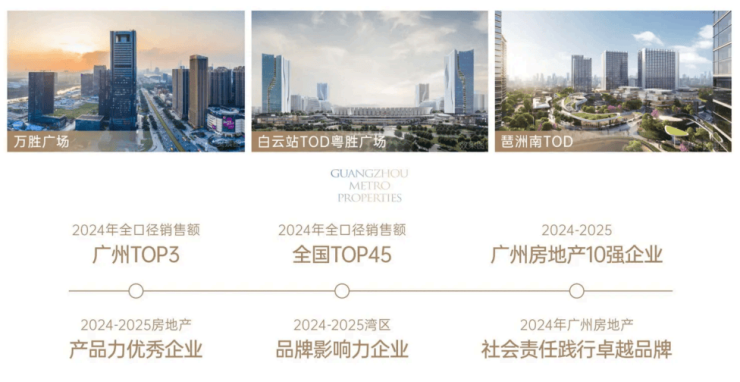 ⼴州地铁地产:30 余载 TOD 开发经验,⾃ 1993 年起布局“轨道 + 物业 + 产业 + ⽣活”,累计开发超 1000 万㎡,打造琶洲南 TOD、⽩云站 TOD 等 20 余个标杆项⽬,2024 年销售额⼴州前三,“上城系”“胜系”产品线成熟度⾏业领先。