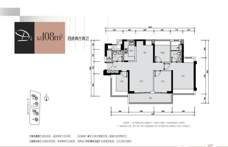 108㎡的4房2厅1卫(户型D),设计的是竖厅南北通透格局,进门入户玄关,客厅3.6米开间,LDKB一体化设计,4个卧室分别做到了3.2米/2.6米/2.5米/2.35米的宽度,主卧加1个次卧270°飘窗设计,U型厨房,得房率:77.51%(不含赠送),阳台主朝西南向。