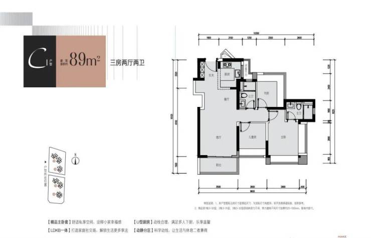 89㎡的3房2厅1卫(户型C),设计的是经典竖厅格局,进门入户玄关,客厅3.5米开间,LDKB一体化设计,动静分区,3个卧室分别做到了3.5米/2.6米/2.55米的宽度,主卧加1个次卧270°飘窗设计,U型厨房,得房率:77.51%